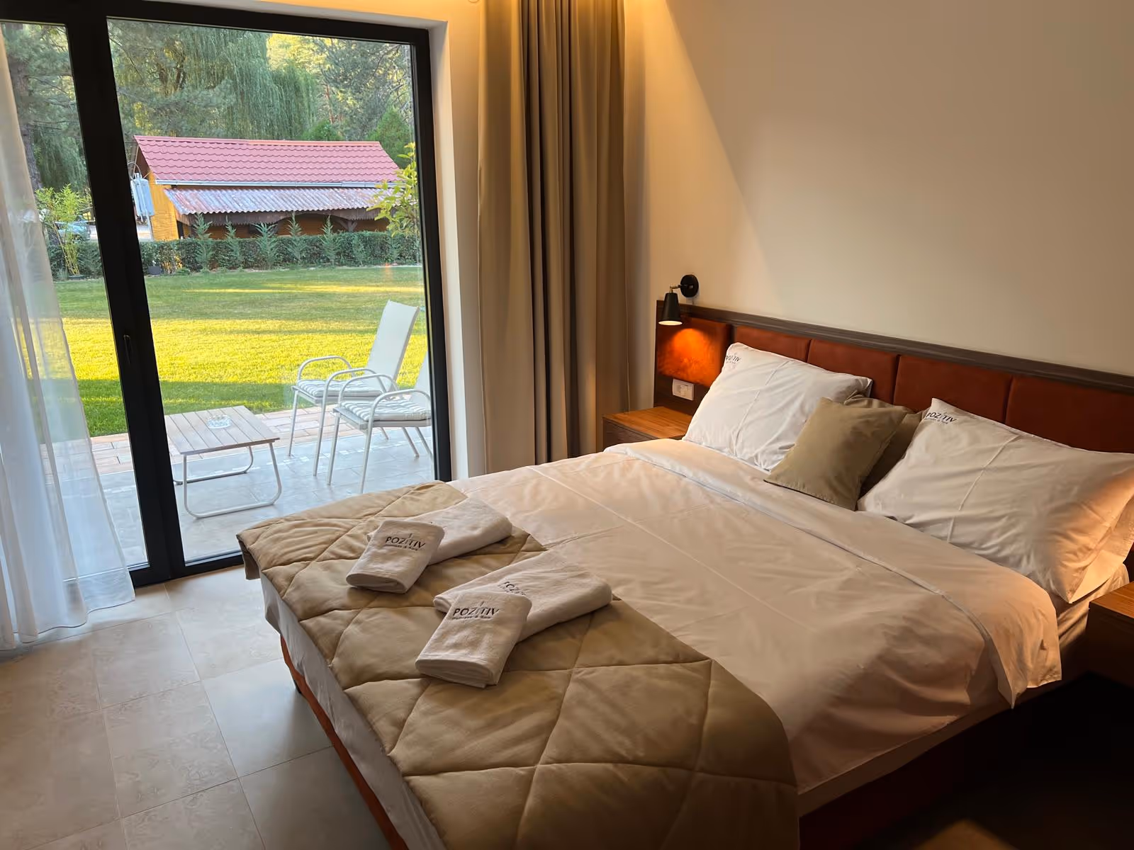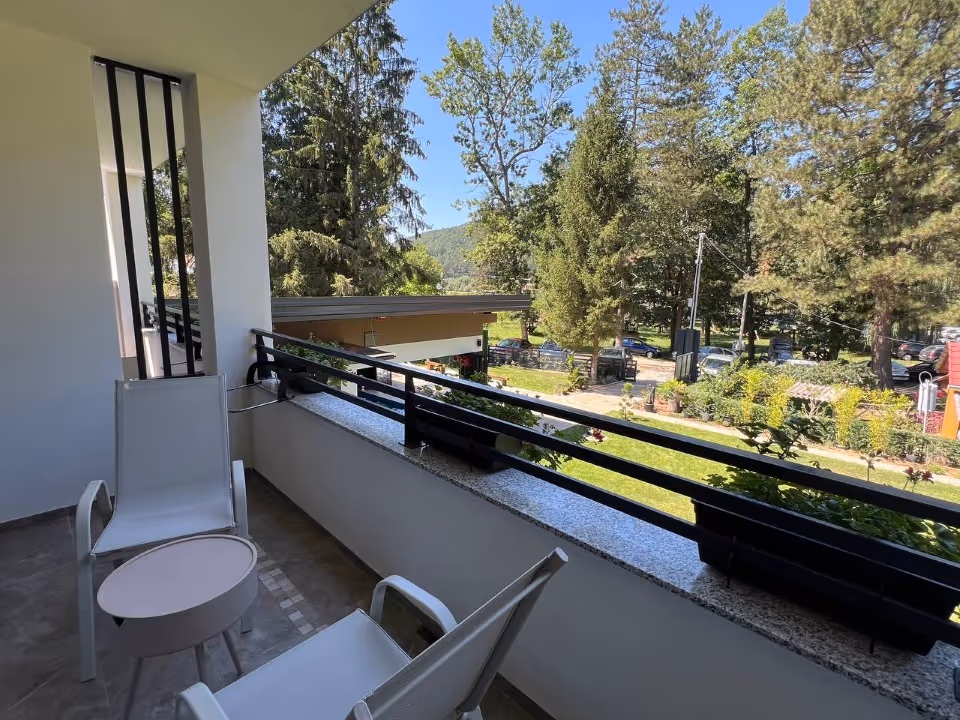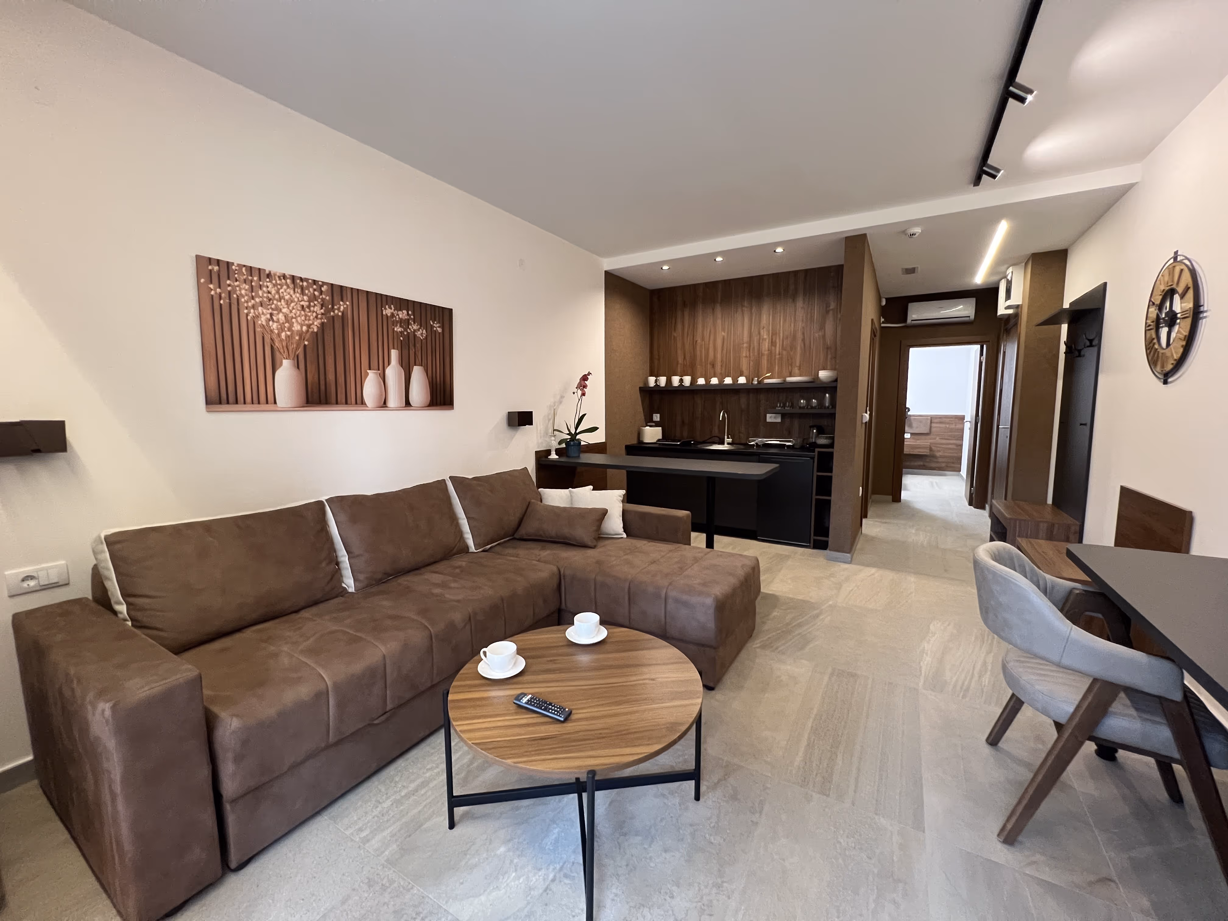Naši apartmani predstavljaju idealan izbor za kraći ili duži boravak kao i porodični odmor. Prostiru se na 45 m² i sastoje se od prostrane dnevne sobe sa udobnom ugaonom garniturom (na kojoj mogu spavati 2 osobe), kuhinje sa trpezarijom, spavaće sobe sa francuskim ležajem (183 × 203 cm), moderno opremljenog kupatila i hodnika. Apartmani imaju sopstvenu terasu sa garniturom za sedenje, koja gleda na park i dvorište.