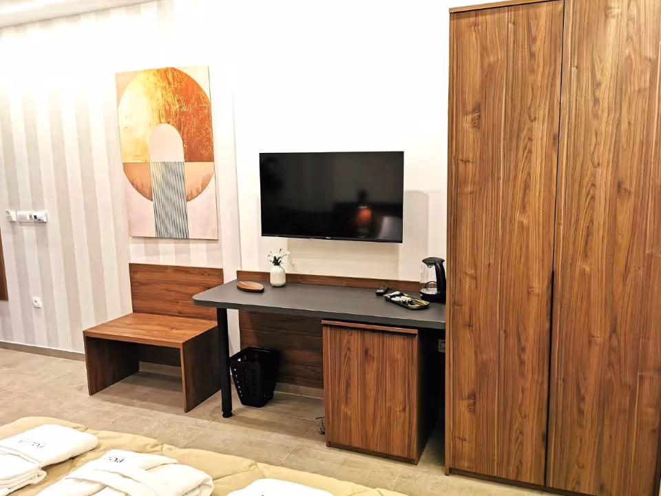 Naši trokrevetni studiji nude udobnost i funkcionalnost za parove ili porodice sa detetom. U okviru jedne svetle i moderno uređene sobe nalazi se francuski ležaj i pomoćni ležaj, kao i terasa sa pogledom na unutrašnje dvorište.U sklopu studija dostupno je: