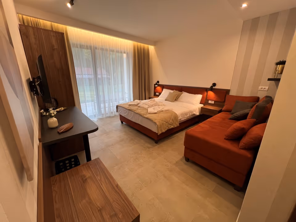 Ova smeštajna jedinica idealna je za porodicu ili manju grupu. Studio se sastoji iz jedne prostrane sobe, hodnika, kupatila i terase sa pogledom na park. U sobi se nalazi francuski ležaj i pomoćni ležaj koji se rasklapa u dodatni krevet, što omogućava udoban smeštaj za četiri osobe.U sklopu studija dostupno je: